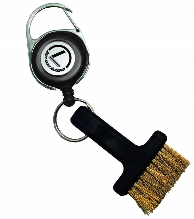 O Groove Brush Pro da Longridge pode ser facilmente fixado numa bolsa de golfe ou na roupa usando seu carretel acoplável.