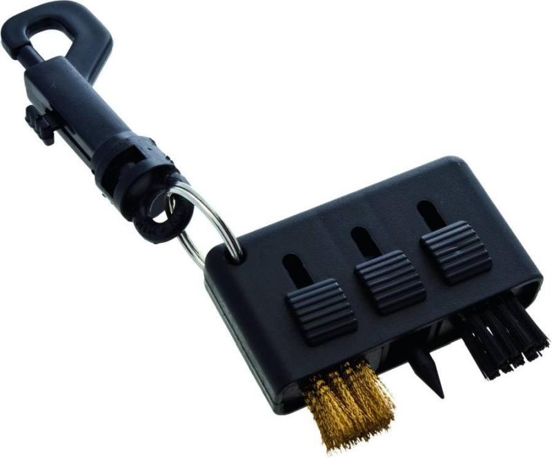 Este pequeno e prático dispositivo de limpeza para golfe contém 3 ferramentas retrateis para limpar e manter